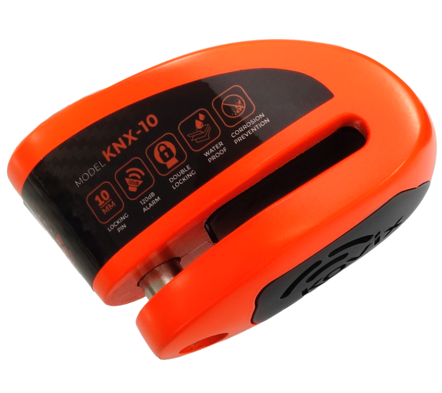 Blokada tarczy hamulcowej z wbudowanych alarmem o natężeniu dźwięku 120 dB z możliwością ustawiania opcji syreny ON/OFF. Zamek ze stali nierdzewnej i wodoodporne podzespoły elektryczne gwarantują ochronę przed korozją i niezawodność w każdych warunkach atmosferycznych. Blokada wyposażona jest w długo pracującą i przyjazną dla środowiska litową baterię. Zabezpieczenie blokuje koło bolcem o średnicy 10 mm, przez co uniemożliwia jazdę i ruch motocykla lub skutera.