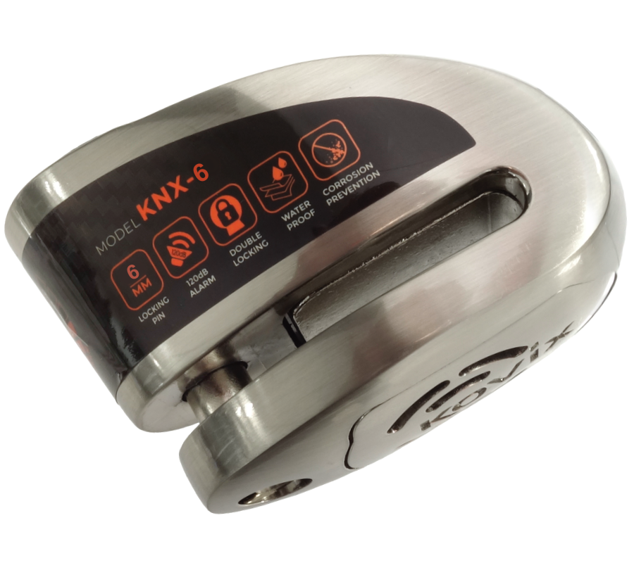 Blokada tarczy hamulcowej z wbudowanych alarmem o natężeniu dźwięku 120 dB z możliwością ustawiania opcji syreny ON/OFF. Zamek ze stali nierdzewnej i wodoodporne podzespoły elektryczne gwarantują ochronę przed korozją i niezawodność w każdych warunkach atmosferycznych. Blokada wyposażona jest w długo pracującą i przyjazną dla środowiska litową baterię. Zabezpieczenie blokuje koło bolcem o średnicy 6 mm, przez co uniemożliwia jazdę i ruch motocykla lub skutera.