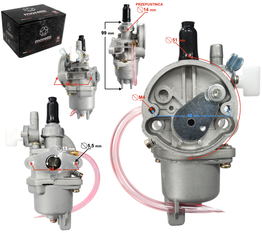 Gaźnik Moretti Pocket Bike, 50cc 4T, p.14mm, ssanie na dźwignię