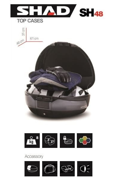 Kufer centralny dedykowany do motocykli i skuterów. Wykonany z trwałego plastiku odpornego na działanie niskich i wysokich temperatur. Mieści pełnowymiarowy kask integralny. Płyta montażowa w komplecie. Mocowania kufra do płyty mocnym zatrzaskiem. Możliwość montażu akcesoryjnego światła STOP. Zamknięcie na kluczyk.