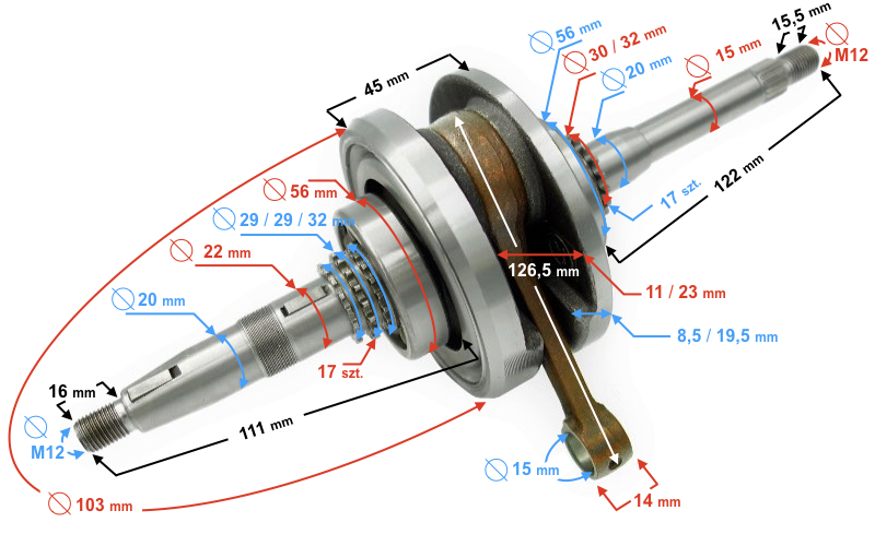 - długość całkowita krótszego ramienia wału: 111 mm